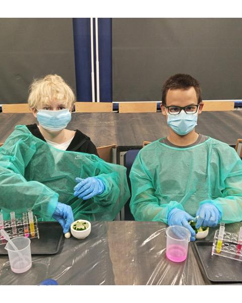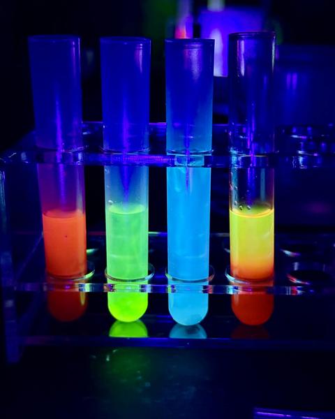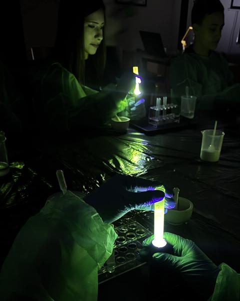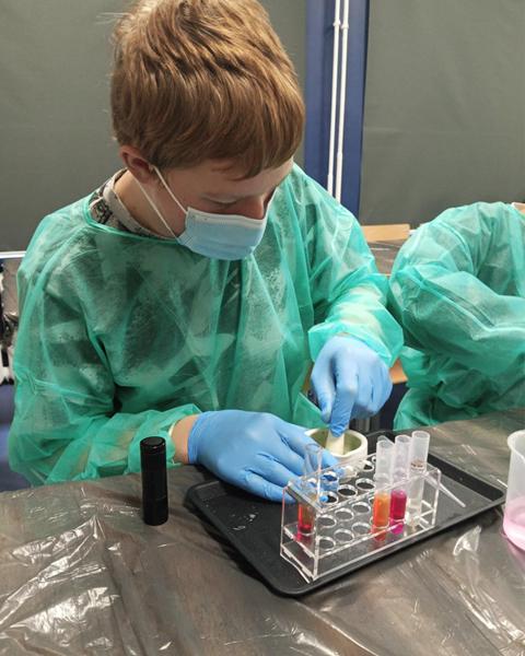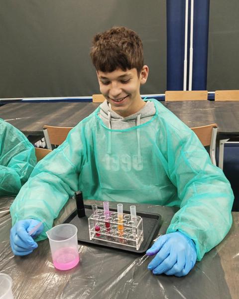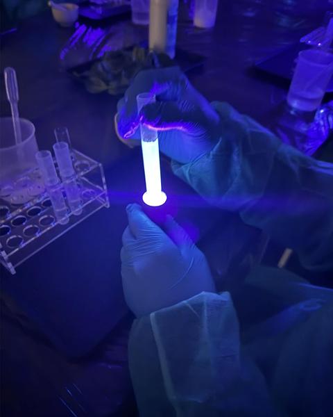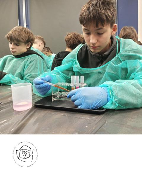 Uczniowie klas 7 i 8 SP naszego Zespołu Szkół uczestniczyli w zajęciach pt. ,,Fluorescencyjne laboratorium”. Poznali oni barwniki m.in Rodaminę B, która wykazuje zjawisko fluorescencji. Stworzyli tęczę w probówce czy wyizolowali chlorofil z liści szpinaku.