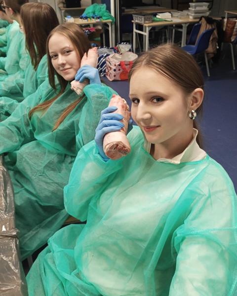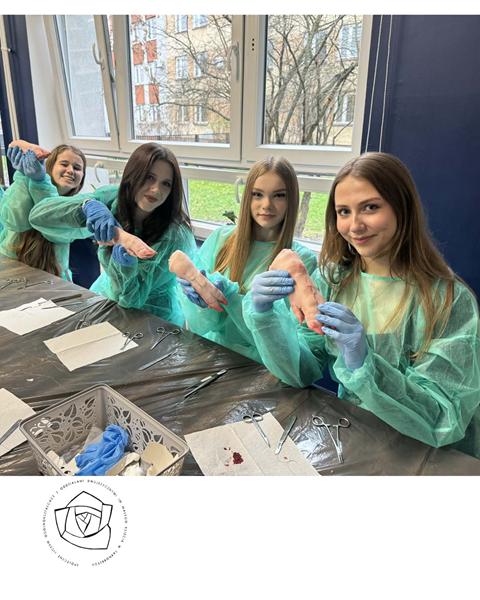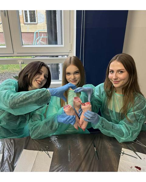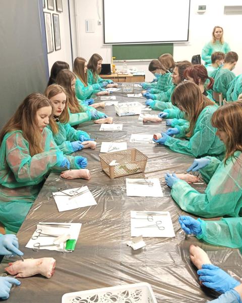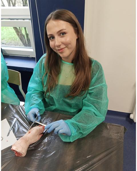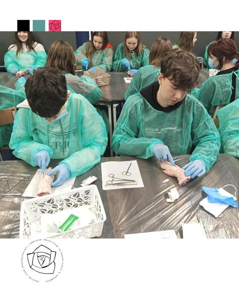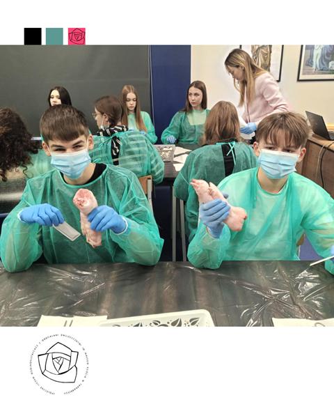 Licealiści z kolei wzięli udział w zajęciach „Szycia chirurgicznego”. Zdobyli wiedzę na temat narzędzi i nici chirurgicznych. Samodzielnie wykonali cięcie skalpelem, a następnie zszycie rany. Do tego celu wykorzystano świńskie nóżki.